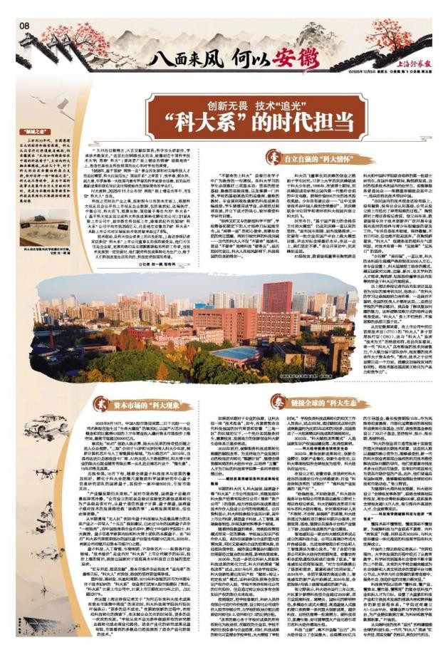 12񀙕日,《上海证券报》整版刊发重磅文章《创新无畏 技术“追光” “科大系”的时代担当》,深情回顾了中国科学技术大学(下称“科大”)南迁合肥后,以“不要命”的精神啃科技硬骨头,最终结出累累产业硕果的历程。